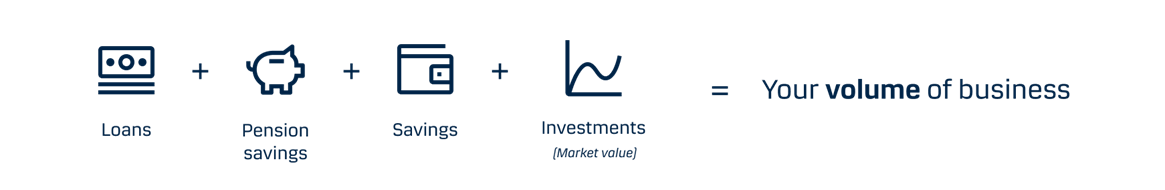 Savings, loans, investments and pension savings with Danske Bank in Denmark, Realkredit Danmark A/S, Danica Pension and Nordania Finans A/S are included in your volume of business.