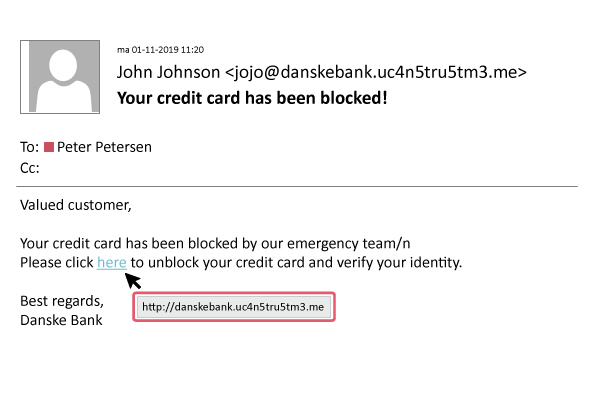 Ved e-mail phishing får du som regel en besked om, at der er et problem med din konto eller dit betalingskort. Det kan også være en besked om, at du skal have penge tilbage i skat, eller at du har en uafhentet pakke.