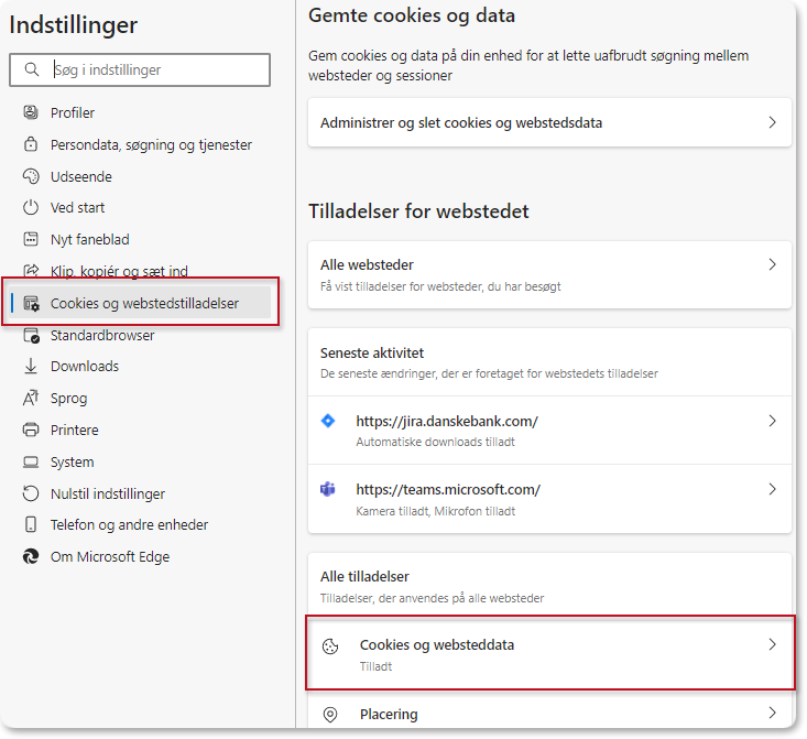 - Klik på 'Cookies og webstedstilladelser' i den venstre menu.