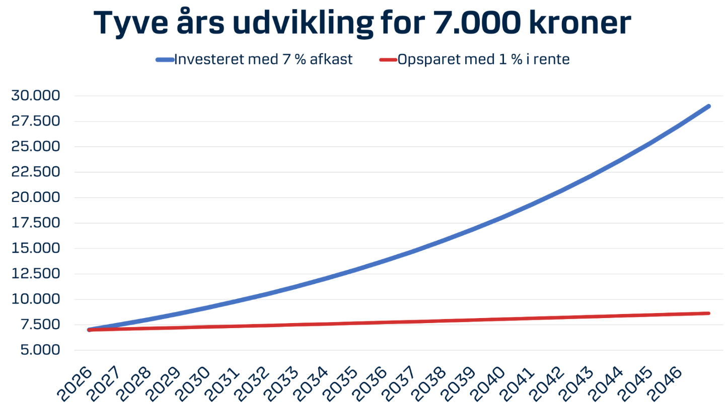 På 20 år vokser de 7.000 til 28.983,94 kroner. Havde du i stedet sat dem ind på en konto med en rente på 1 %, var de til sammenligning blevet til 8.626,74 kroner.