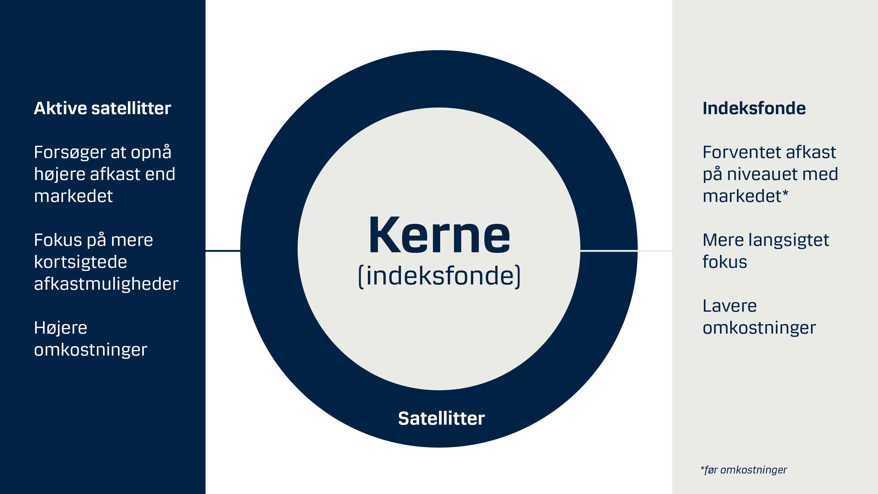 • Kernen: Cirka 80% af din portefølje – den stabile base.
