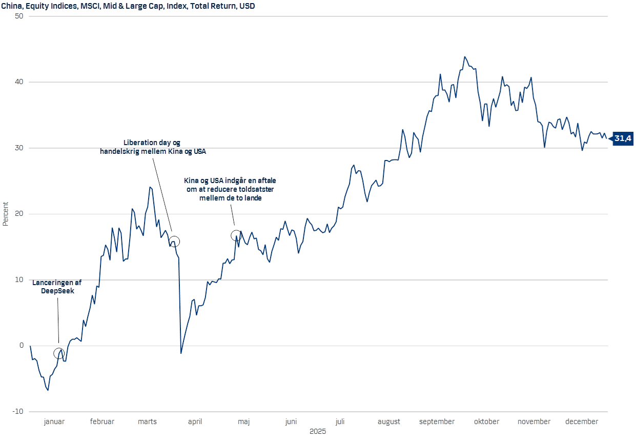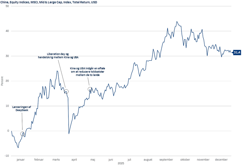 På denne graf ses det, at det kinesiske aktiemarked alt i alt var kendetegnet af pæn fremgang i 2025: