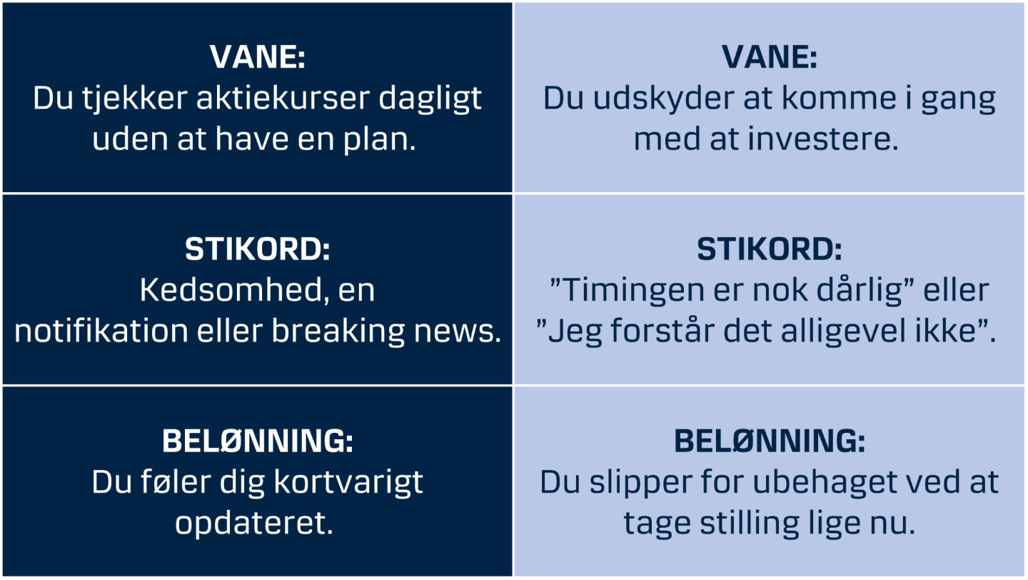 Vil du gøre investering til en god vane, handler det altså ikke om at finde den perfekte strategi. Det handler derimod om simple og konkrete stikord, rutiner og belønninger. Og husk et klart mål.