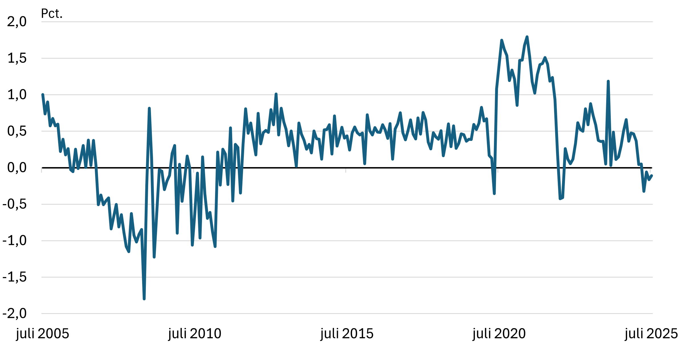 Grafen viser den månedlige udvikling i boligpriserne i USA. Kun få gange siden årene omkring finanskrisen har prisudviklingen været negativ.