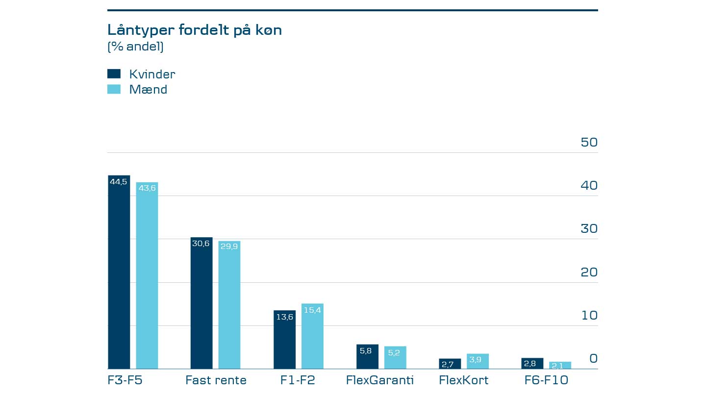 Det mest almindelige realkreditlån for begge parter er nemlig F3- og F5-lån. Derefter følger de fastforrentede lån og på tredjepladsen ligger er F1-lånet. Hos både mænd og kvinder er der også en tendens til at vælge lån med højere risiko, jo større lånet er i kroner og øre.