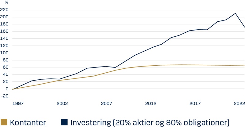 Denne graf viser en, hvordan en kontant opsparing ville have udviklet sig på 25 år sammenlignet med at have investeret det tilsvarende beløb med en forsigtig risikotilgang – og det er tydeligt, at det investerede vokser sig større i perioden: