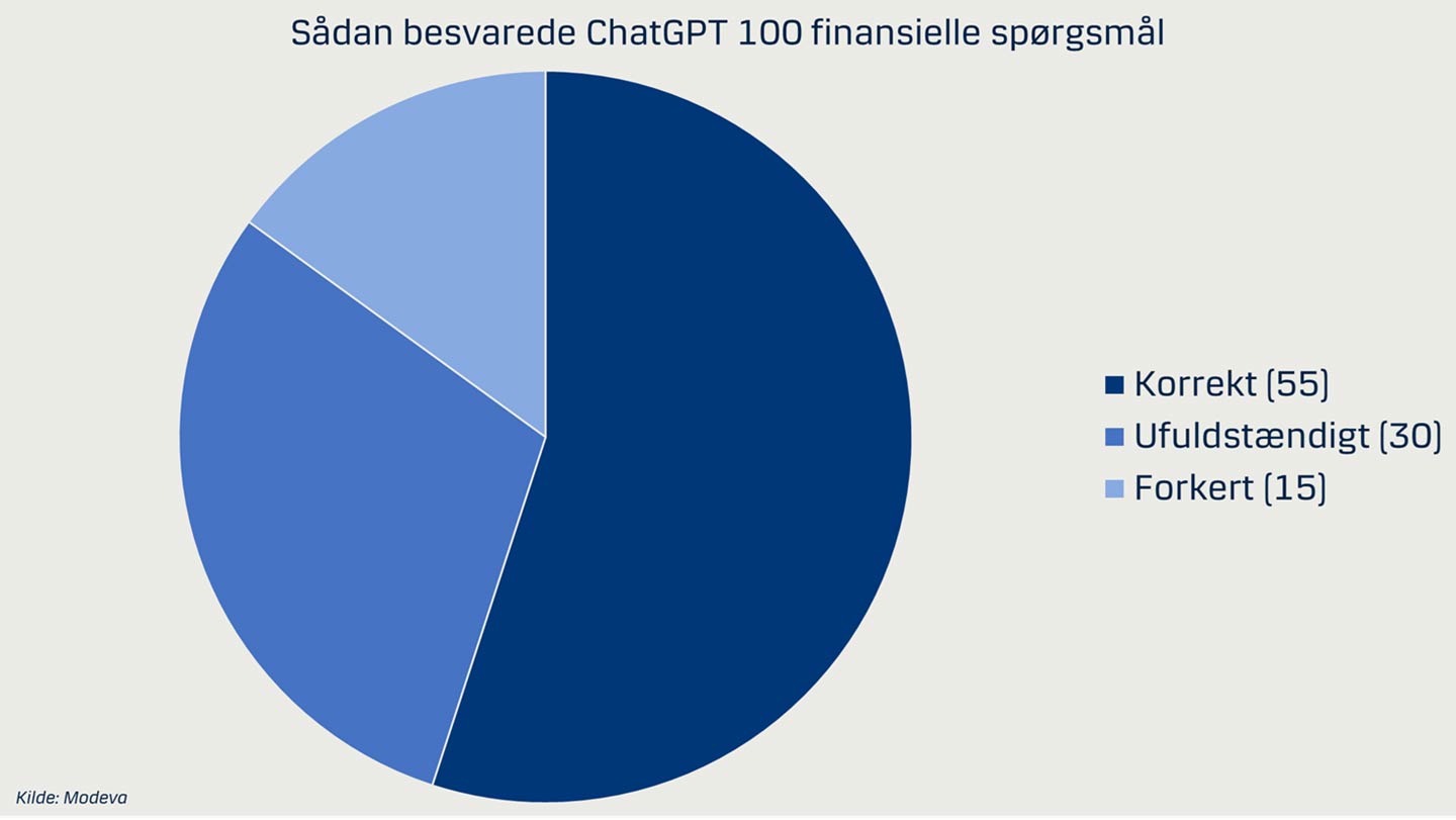 Undersøgelsen er lavet i juli 2025 af virksomheden Modeva. De stillede ChatGPT 100 spørgsmål, hvor svarene blev vurderet af fire økonomiske eksperter som enten korrekte (55), ufuldstændige (30) eller forkerte (15).