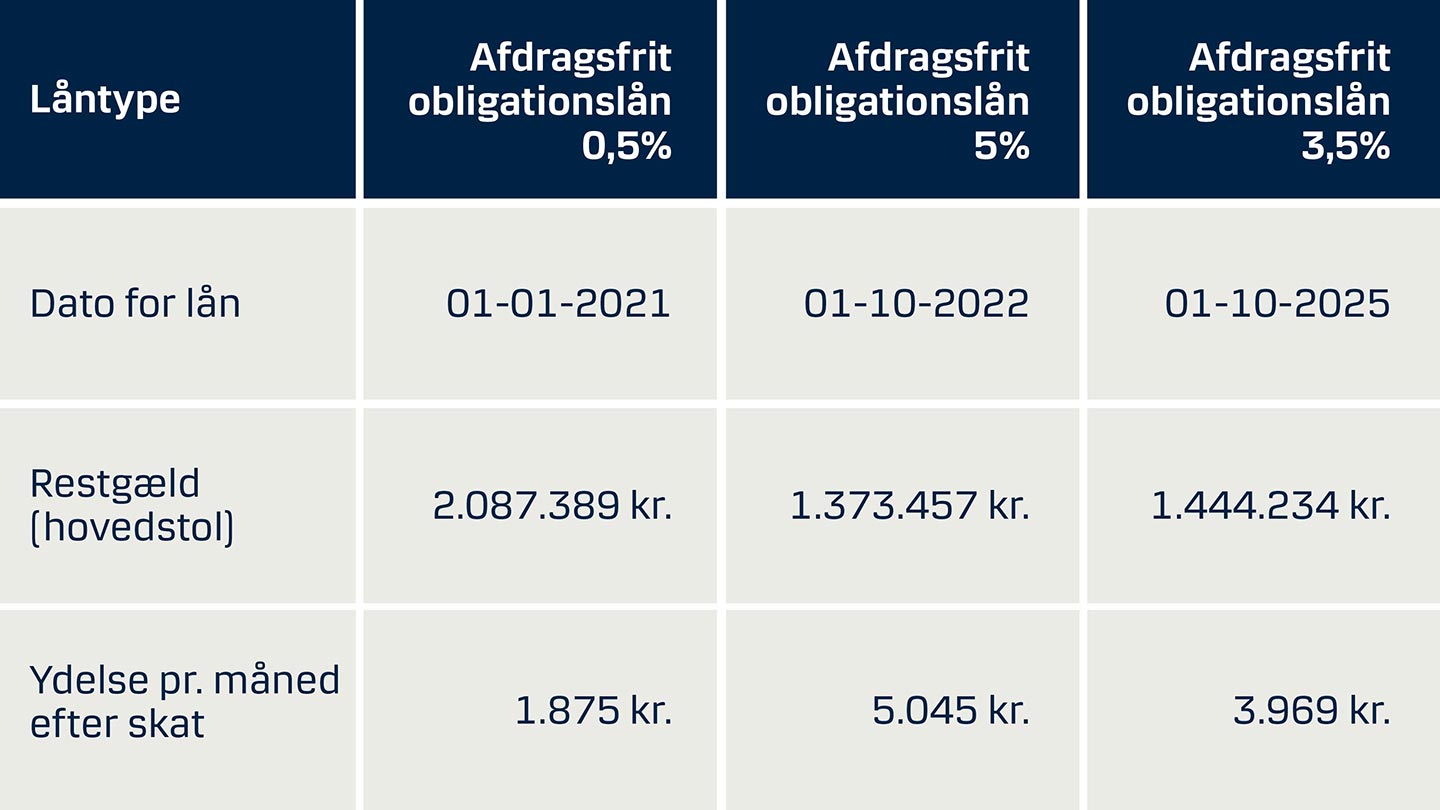 Anders og Marianne har et fastforrentet, afdragsfrit realkreditlån, som de optog i 2021 til en kursværdi på 2 millioner kroner. De havde en fast lav rente på 0,5 %, som de så valgte at opkonvertere til et lån med 5 % i rente i 2022.