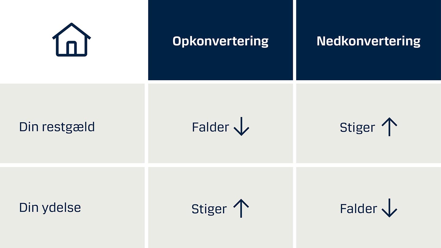 - For en nedkonvertering gælder det modsatte: Her omlægger du lånet, når renten falder for at få en lavere ydelse. Til gengæld stiger din restgæld en smule.