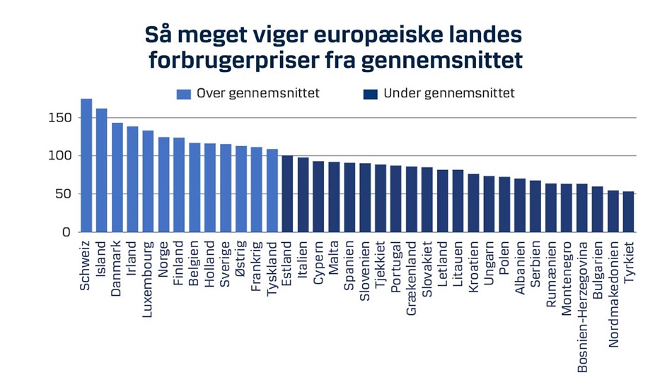Ifølge 2024-tallene fra Eurostat er prisniveauet i Danmark det tredjehøjeste i Europa – kun overgået af Schweiz og Island, der er henholdsvis 74 og 61 % højere end gennemsnittet.