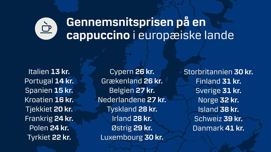 I Danmark skal du i gennemsnit give 41 kroner for en cappuccino, mens den i sit hjemland Italien blot koster 13 kroner. Og ligesom med ølpriserne er Spanien og Portugal også godt med, hvor cappuccinoerne koster henholdsvis 15 og 14 kroner. Kroatien er også blandt de billigste lande med 16 kroner.