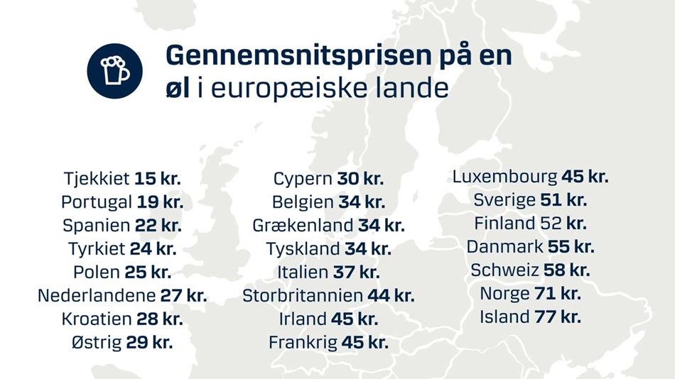 Det er kun i Norge og Island, at fadøl er dyrere end de gennemsnitligt 55 kroner, som du betaler for en kold fadøl herhjemme. Du kan derimod komme lidt længere på literen, hvis du tager til Tjekkiet, hvor en halv liter kan fås til omkring 15 kroner. Spanien og Portugal er også blandt de billigste øl-nationer med priser på henholdsvis 22 og 19 kroner for en halv liter.