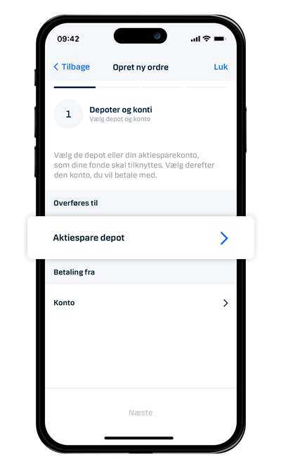Har du allerede oprettet en aktiesparekonto i forvejen, skal du blot sørge for at vælge ”Aktiespare depot”, når du vælger depot under oprettelsen af din månedsinvestering. Du opretter Danske Månedsinvestering i mobilbanken under Investeringer > Vælg investering.