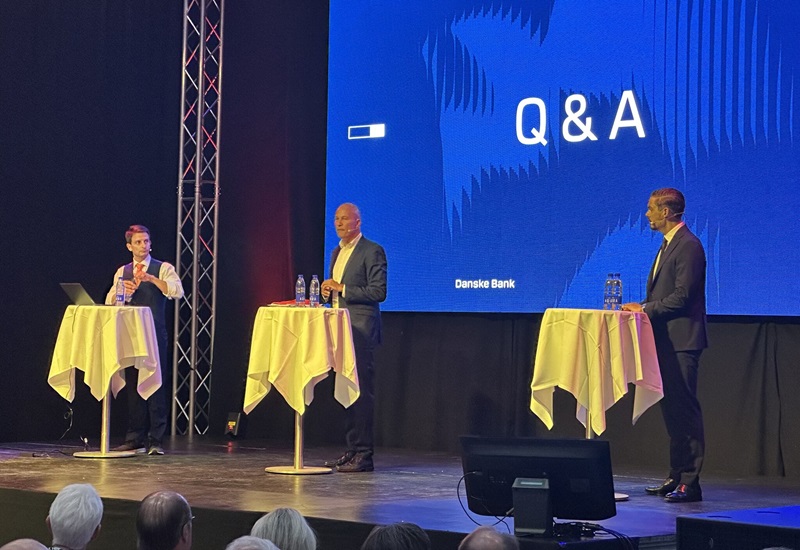 “Journalist Jesper Steinmetz (i midten), investeringsdirektør Thomas Otbo (th) og chef-porteføljeforvalter Bo Bejstrup (tv) svarede på spørgsmål fra scenen”