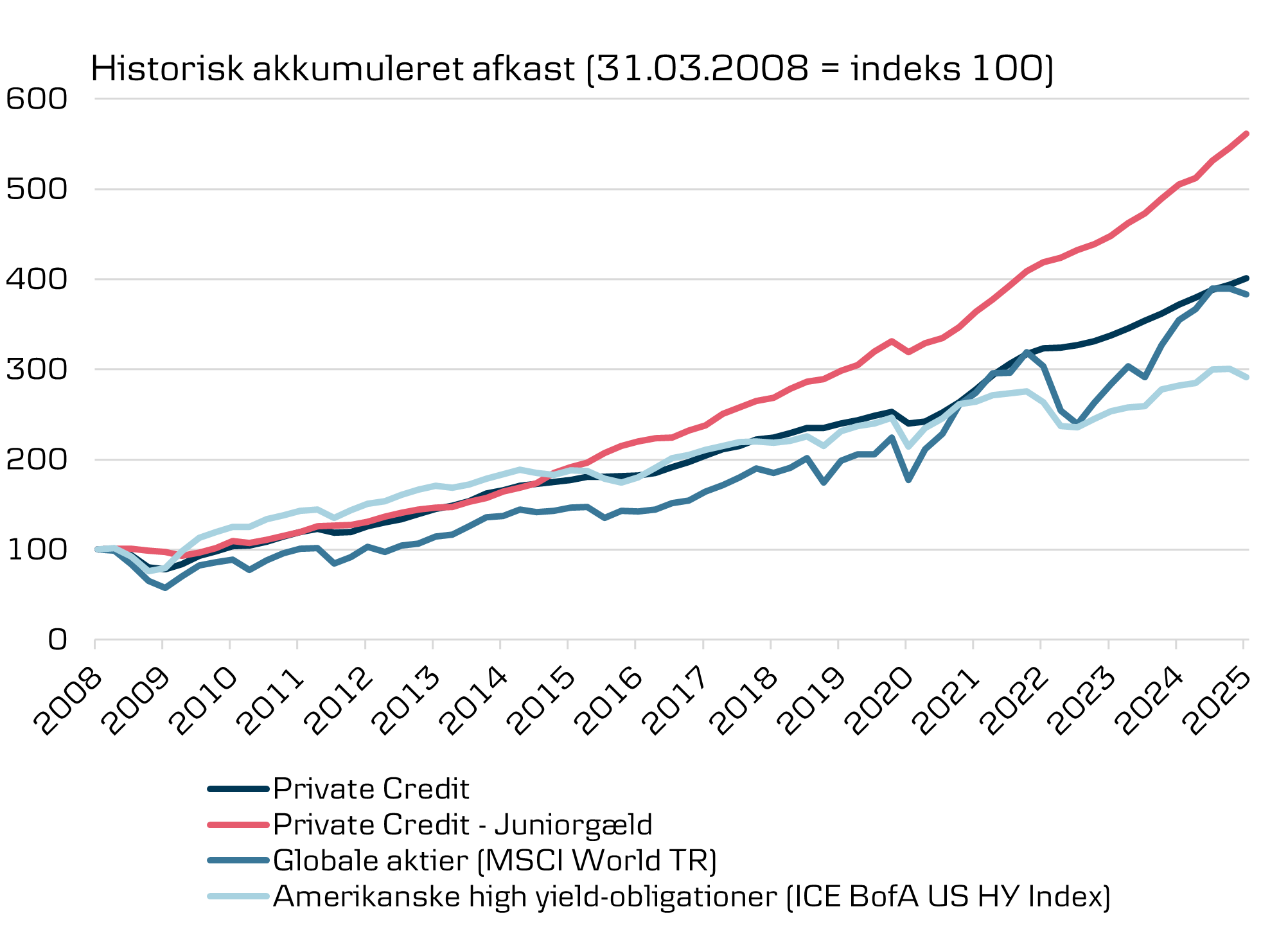 Ser vi på afkast fra marts 2008 til marts 2025, har private credit-fonde givet et højere akkumuleret afkast end amerikanske high yield-virksomhedsobligationer og globale aktier. Det gælder både for private credit generelt og for juniorgæld i særdeleshed. Juniorgæld hører blandt den mere risikofyldte del af private credit og vil også udgøre en markant del af porteføljen i West Street Strategic Solutions II fra Goldman Sachs.