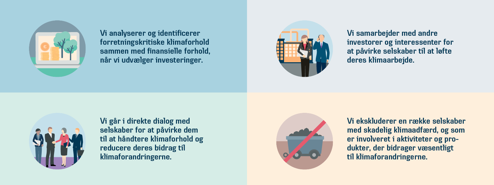 Investeringsteams analyserer, hvordan klimaforhold påvirker selskabernes forretning, når de udvælger investeringer til kunderne. Baseret på analysen kan de udvælge selskaber, der håndterer klimaforhold, er i gang med at reducere klimabelastningen eller omfavner grønne muligheder. Selskabernes evne til at omfavne den grønne omstilling er nemlig en faktor for de potentielle afkast, de kan skabe i fremtiden.