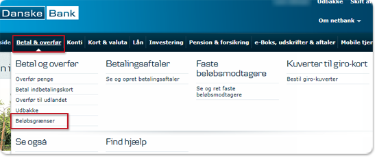 - Klik på 'Betal & overfør' i den øverste menu og vælg 'Beløbsgrænser'.
