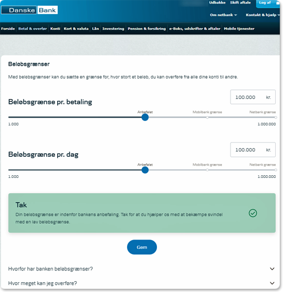 - Klik på 'Gem', når du har valgt den ønskede beløbsgrænse.