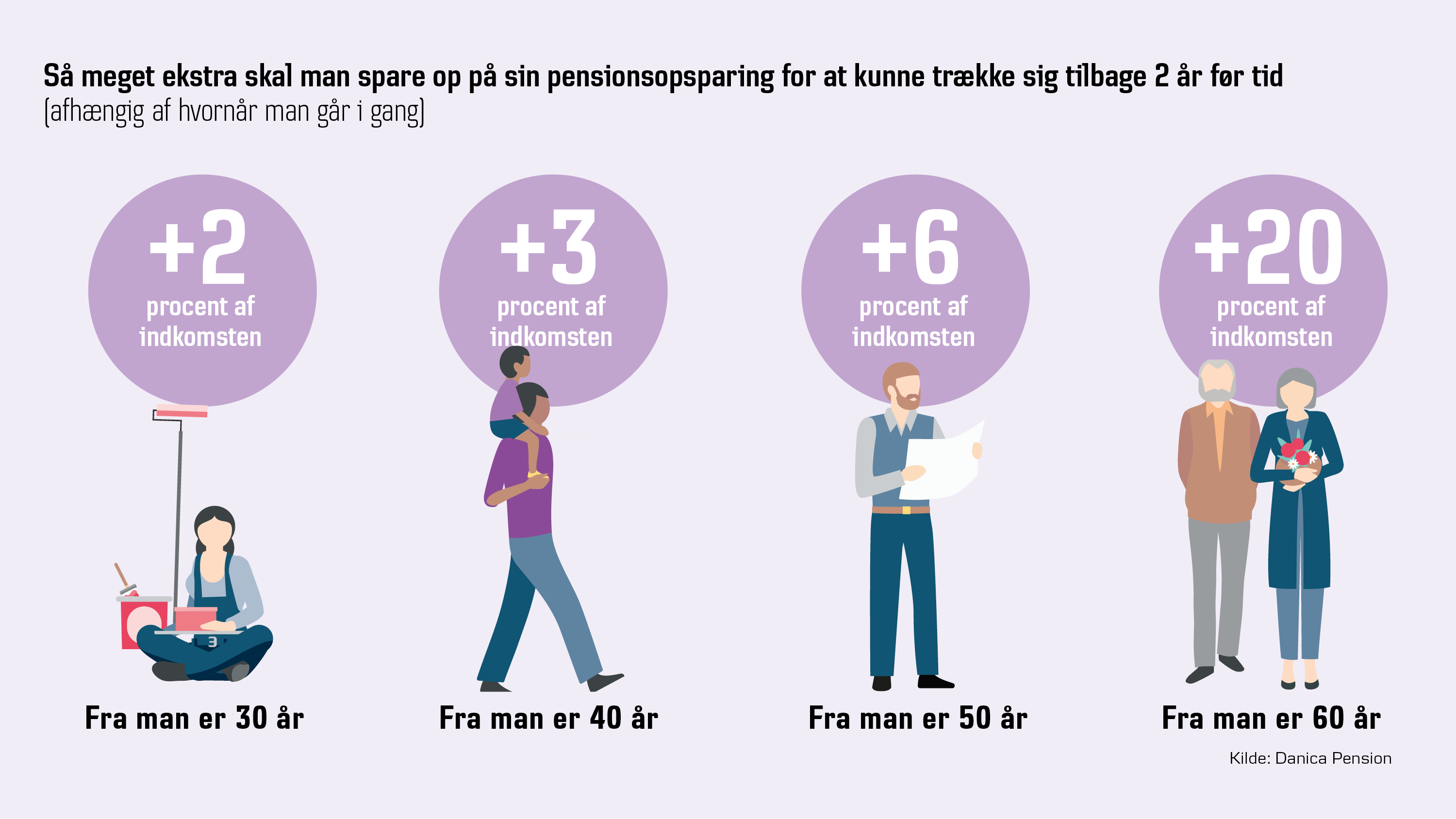 Et eksempel: Ole Hansen er lige fyldt 50 år. For at få mere tid til at rejse vil han gerne gå på pension, når han er 68 år – i stedet for at vente til han er 70 år. Oles beslutning kræver en ekstra opsparing på 6 procent af hans indkomst.